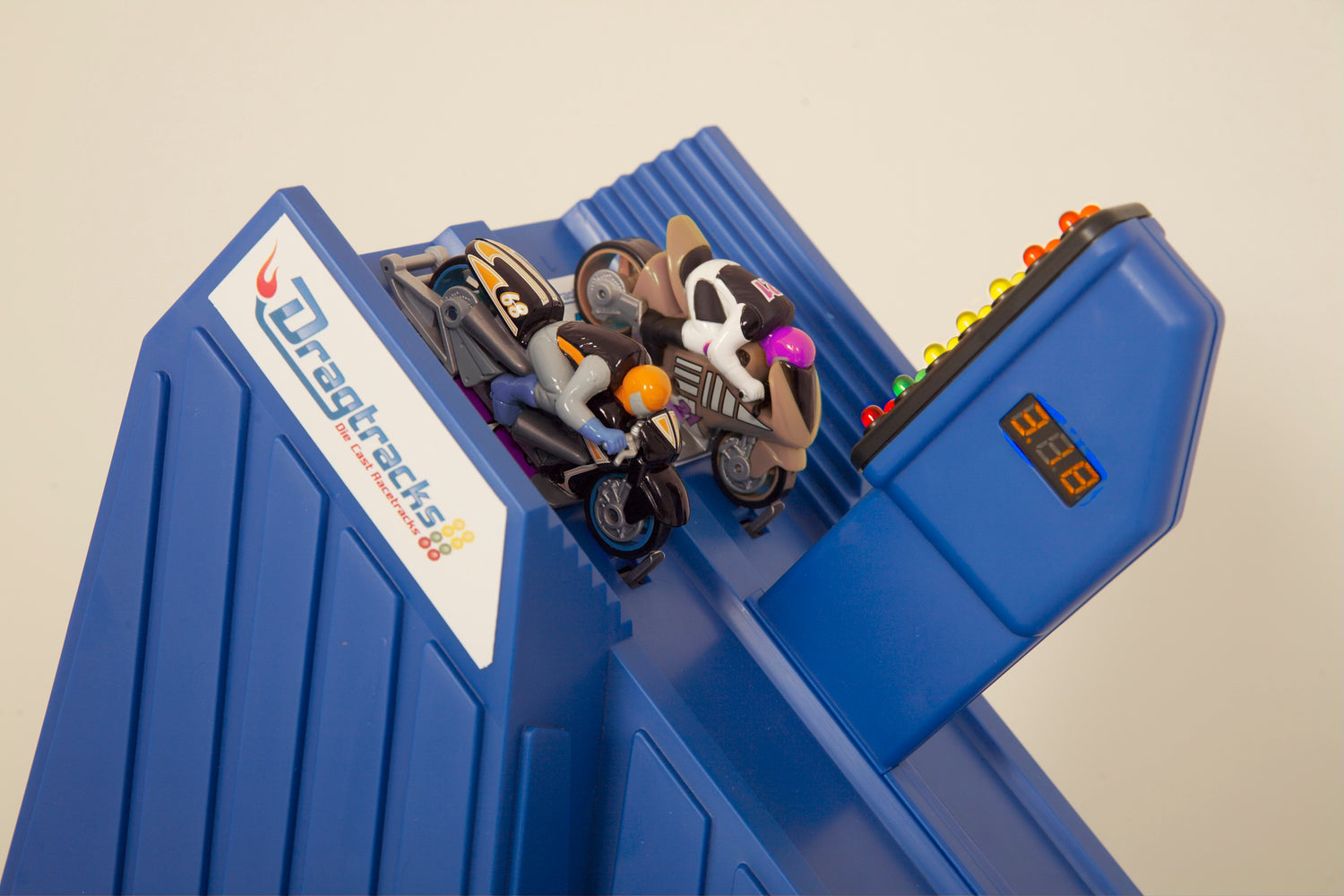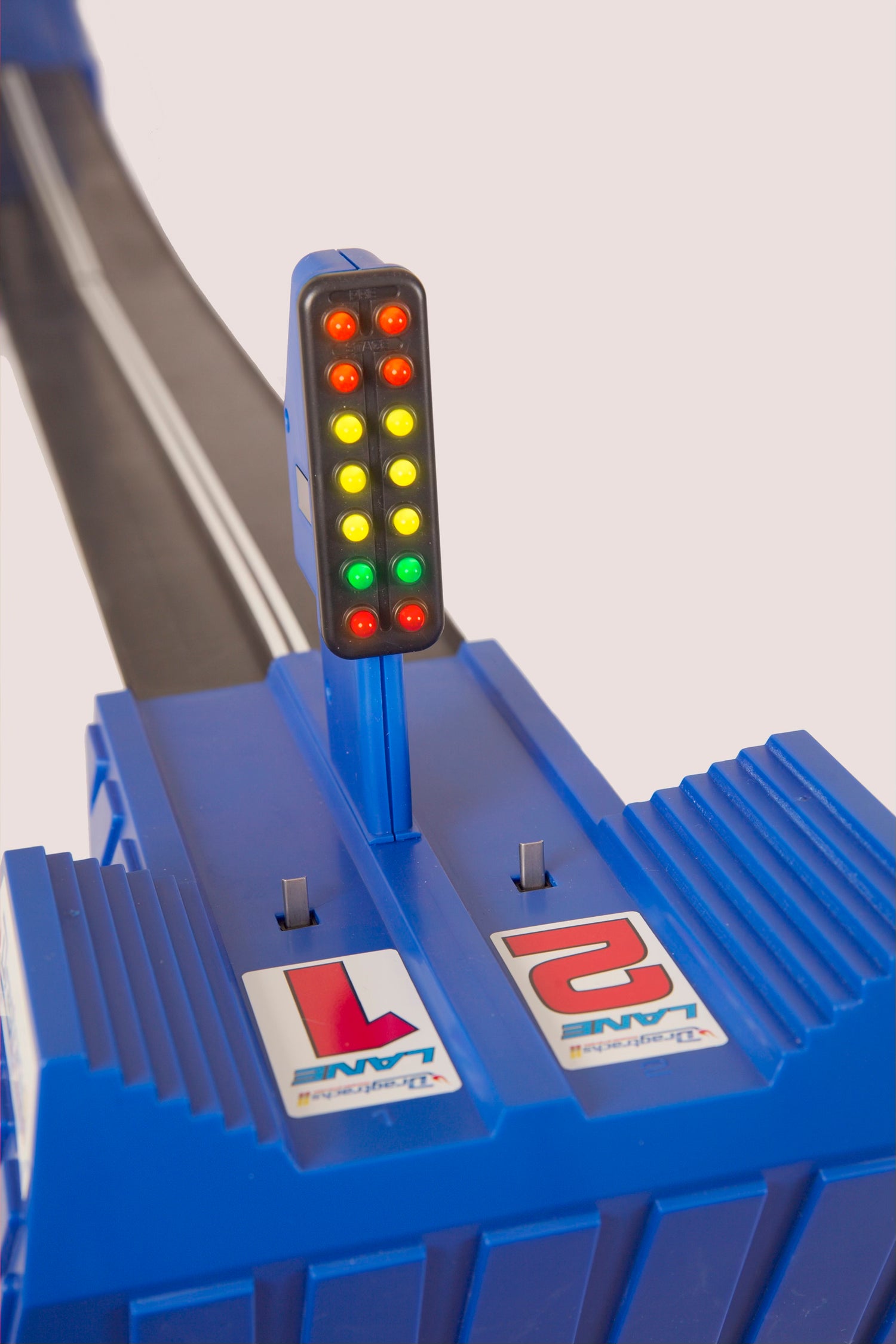 No more pretend! Race any 1:64 scale die-cast cars with over 17' of track. Dragtracks features a real Sportsman and Pro style LED starter tree, digital finish line, sound effects as well as E.T. & R.T. timed display.